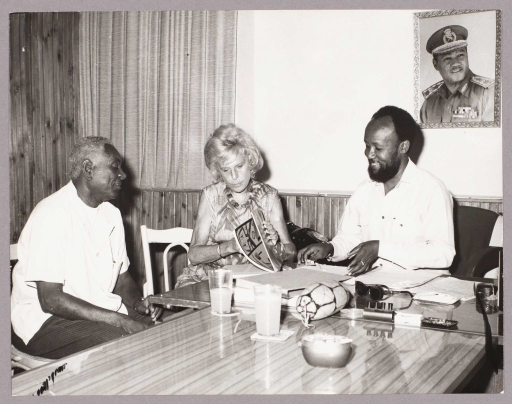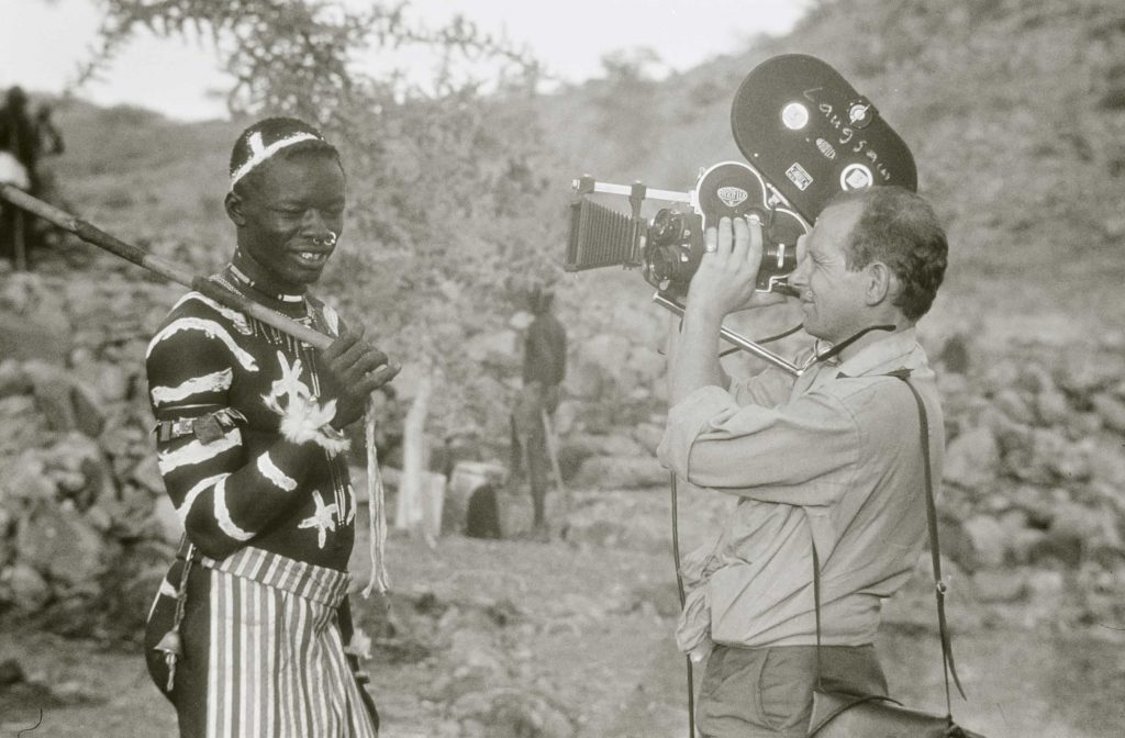 جبال النوبة، منطقة مساكين، من المرجّح أنها لقطات دعائية لجهاز تسجيل Uher، ديتر كوخ ممسك بذراع الميكروفون ووالتر هايلر خلف الكاميرا، السودان، 1965