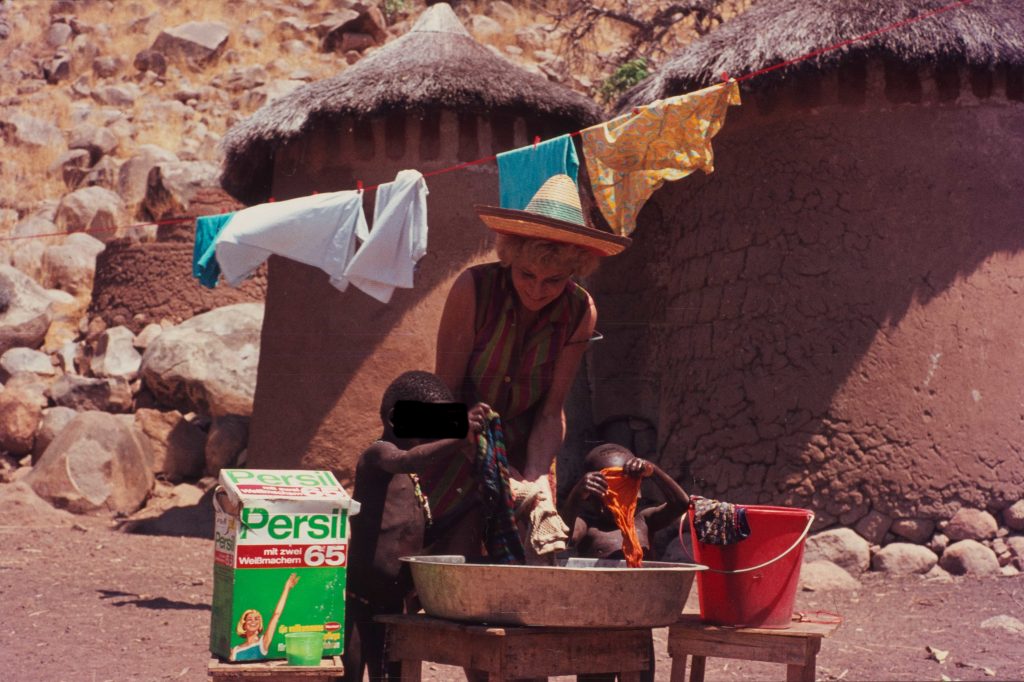 Nuba Mountains, Masakin region, presumably advertising shots for the Uher tape recorder, Dieter Kock with microphone boom and Walter Hailer at the camera, Sudan 1965 (Staatliche Museen zu Berlin – Kunstbibliothek, Riefenstahl estate)