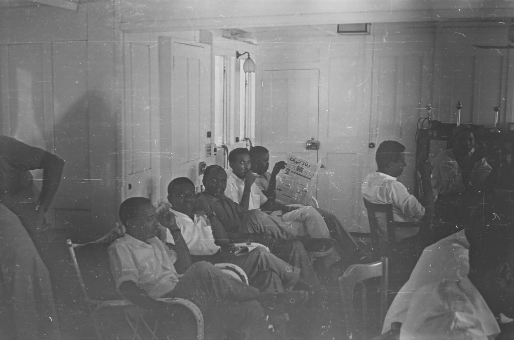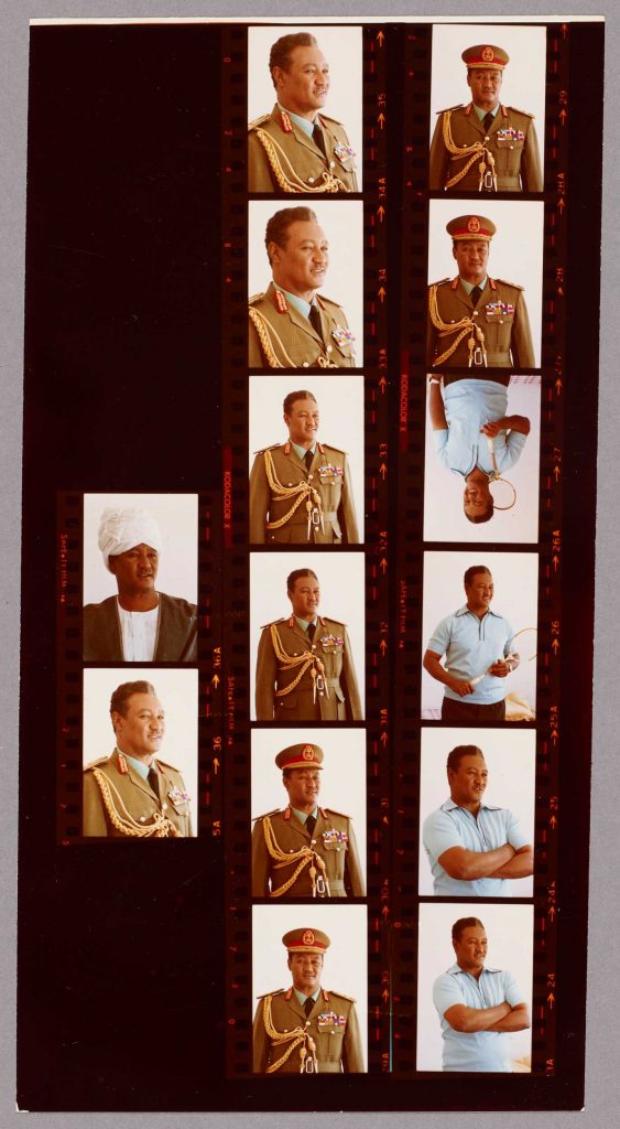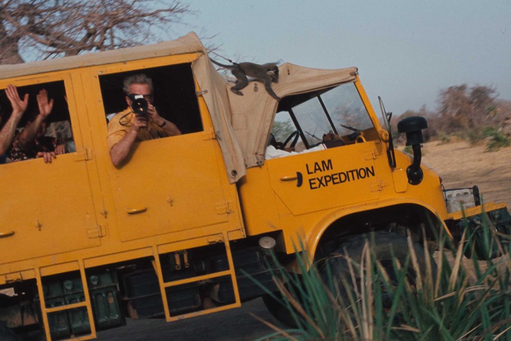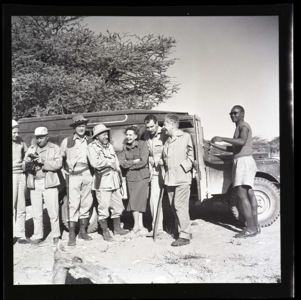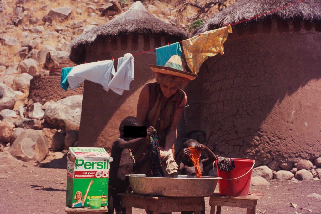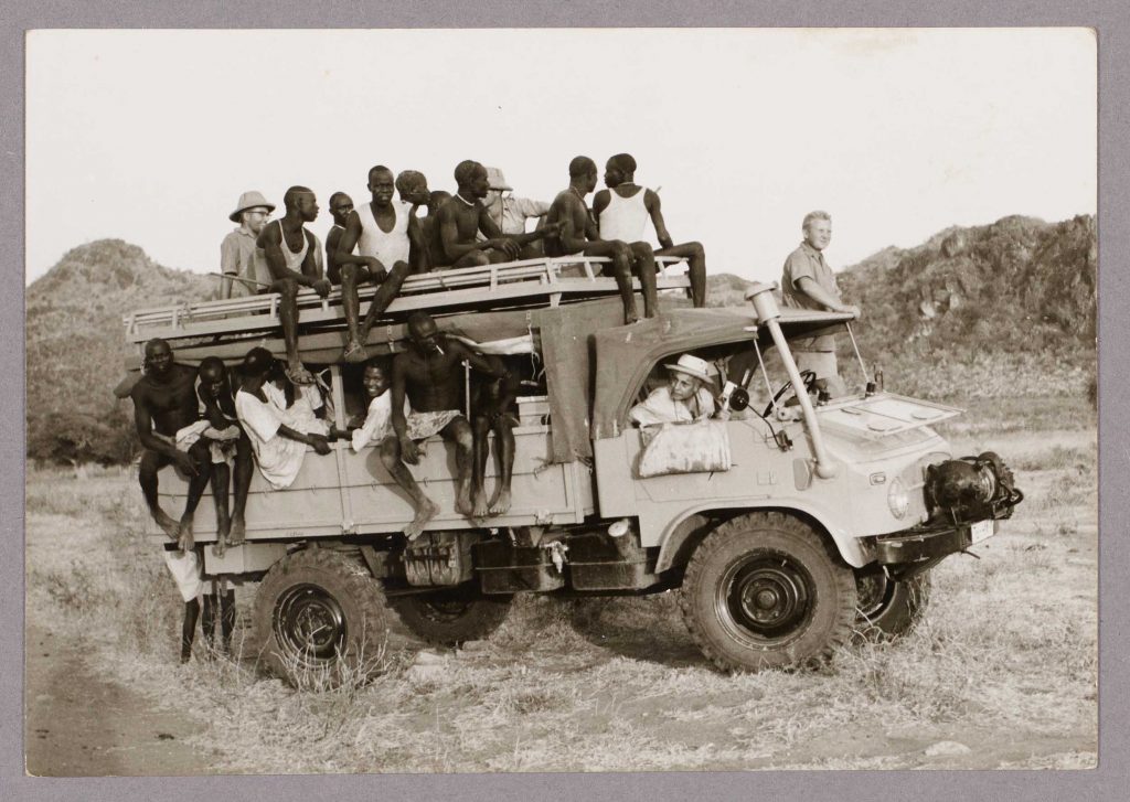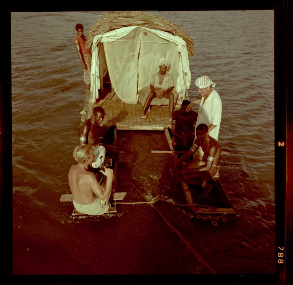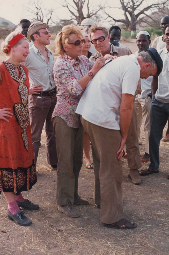 Nuba-Berge, Region Masakin, vermutlich Werbeaufnahmen für das Tonbandgerät von Uher, Dieter Kock mit Mikrofonangel und Walter Hailer an der Kamera, Sudan 1965 (Staatliche Museen zu Berlin – Kunstbibliothek, Nachlass Riefenstahl)