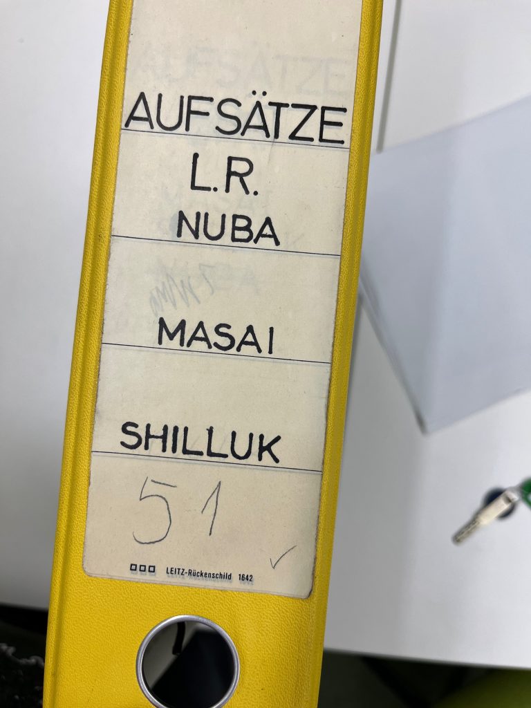 So findet sich beispielsweise unter weiß die Korrespondenz mit der Filmarchitektin Isabella Ploberger-Schlichting zu ihrer Namensnennung für die Filmproduktion „Tiefland“ oder Briefe von Arnold Fanck mit Ideen zur Vorführung von Filmen in Afrika. Unter blau zeugen Berichte, Briefe, Zeitungsausschnitte von nicht realisierten Filmprojekten, z. B. „Der Nil“. Gelb führt zu Riefenstahls Aufsätzen, darunter Texte über die Nuba (Abb. 2). Schwarz gefasst ist der vertragliche Schriftverkehr wie jener über die geplante Verfilmung der 1987 von Riefenstahl veröffentlichten „Memoiren“.