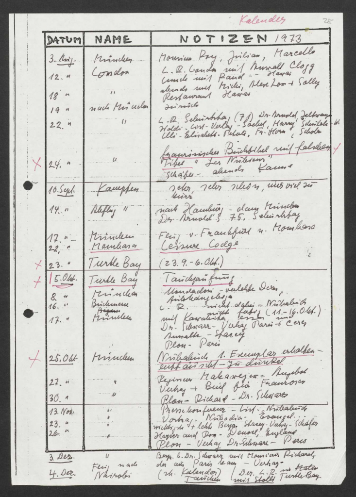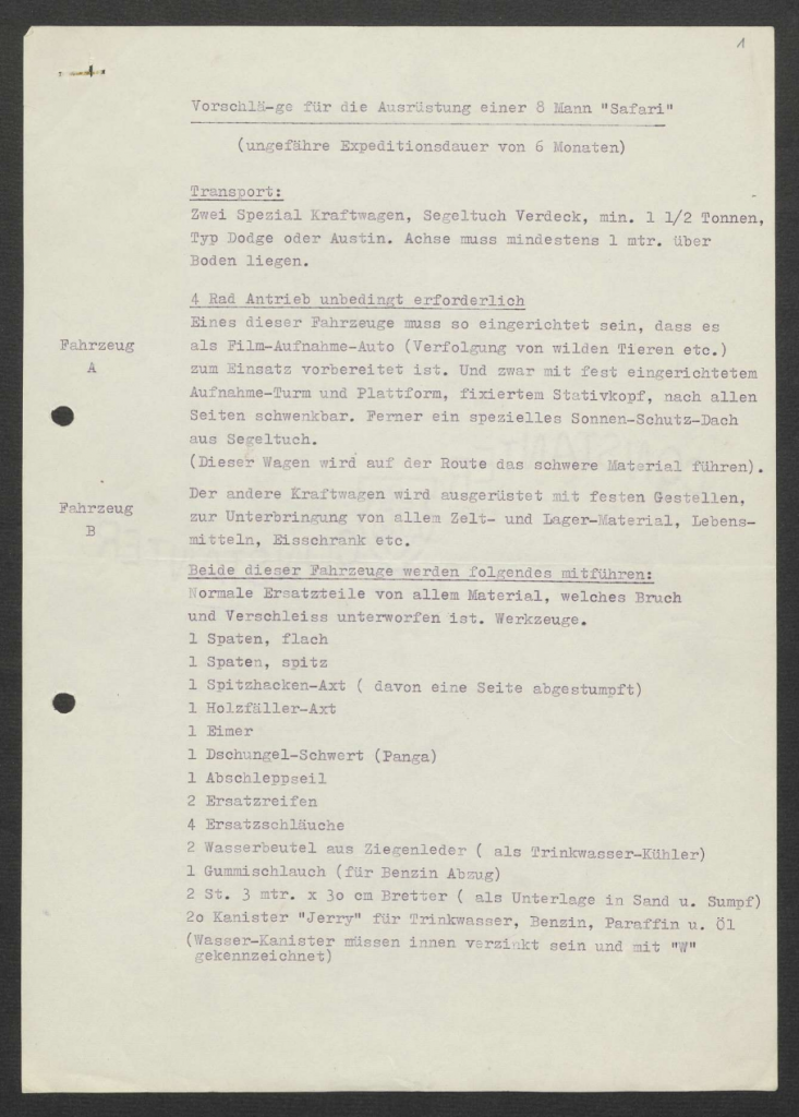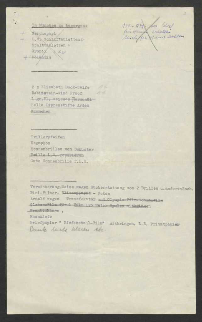 Es sind allesamt Zeitdokumente, die auch Einblicke in Riefenstahls Reiseideen geben: von ihren persönlichen, geschäftlichen und organisatorischen Vorbereitungen (Abb. 3) über die Expeditionen selbst bis zur publikumswirksamen Präsentation ihrer Projekte, sei es in Form von Fotografien, Filmen, Publikationen, Vorträgen oder Ausstellungen.